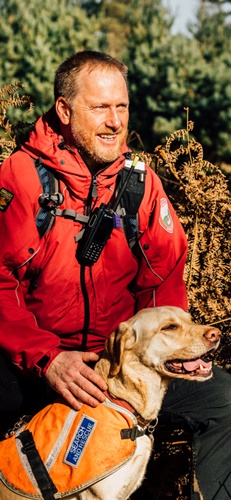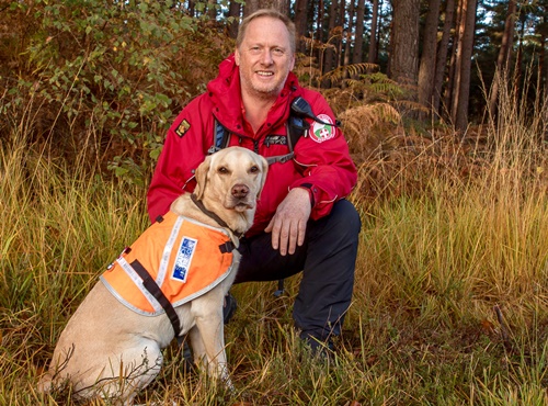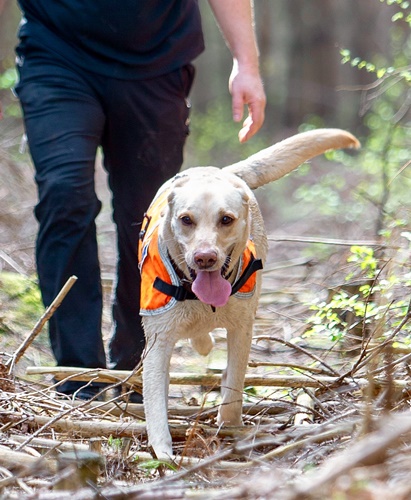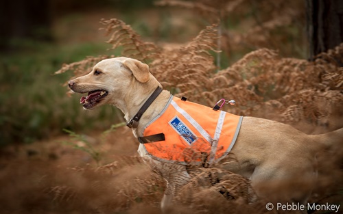 At work with the Search team Bruce is focused and very driven. He will get very excited if he sees me pick up my boots as he knows he’s going out to work or to a training session. Bruce is a Level Three Search Dog and he can range or distance himself from me quite extensively whilst looking for people. Because of this Bruce wears a fluorescent search jacket which has bells and a light on it so that I know where he is at night. He’s a strong and fit dog allowing him to search effectively for over 2 hours at a time in all weathers, covering over 50 acres of woodland during a search is not unusual for him.
