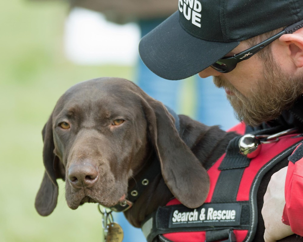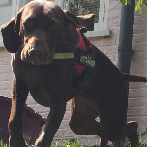 Grace is a German Short Haired Pointer and is very hard working but very much expects the same from her handler. We run at a fierce pace working the area looking for our Mispers. We cover a lot of ground very quickly as often time is of the essence. She really loves it but to be honest she likes the cat food more – she only gets it when she finds someone. And it really stinks! She has a complex character and is very much a one master dog and will often let me know what she thinks, either through disapproving looks or furious tail wagging. She is a real character – and always has something to say….. Grace passed her Level 2 qualification in April 2021.